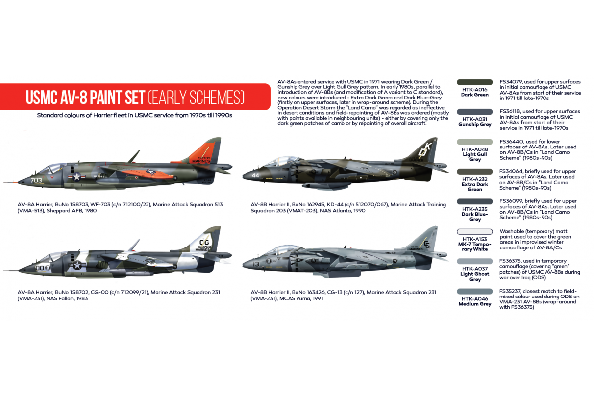 • HTK-A232 – Extra Dark Green – FS34064, briefly used for upper surfaces of AV-8As. Later used on AV-8B/Cs in „Land Camo Scheme” (1980s-90s)
