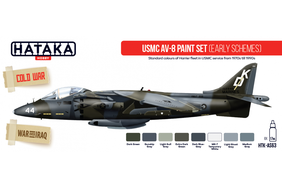• HTK-A048 – Light Gull Grey – FS36440, used for lower surfaces of AV-8As. Later used on AV-8B/Cs in „Land Camo Scheme” (1980s-90s)