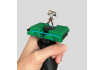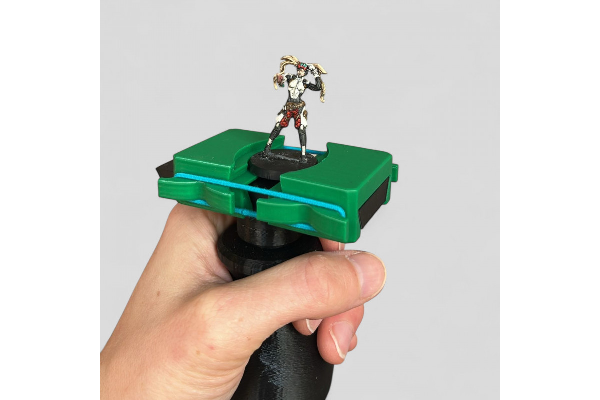 The holder features interchangeable attachments. One attachment has holes for inserting a miniature mounted, for example, on a skewer. The other attachment functions as a clamp with rotating jaws – straight on one side and curved on the other to match the most common miniature base diameters used in wargaming. The attachments are secured with magnets and can rotate around the central axis, allowing convenient positioning of the miniature while painting.