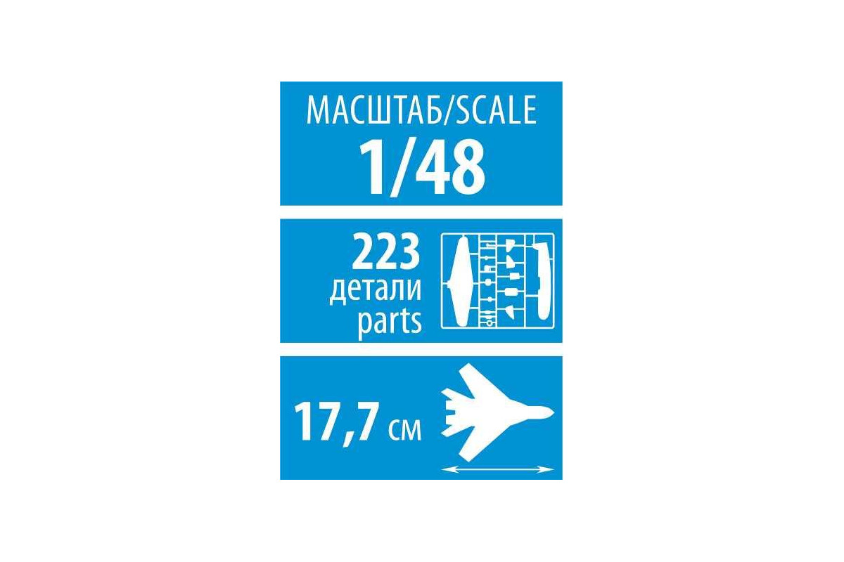 Model letadla ke slepení. Velikost: 1:48; 17,7 cm. Balení obsahuje: 223 dílků ke slepení.